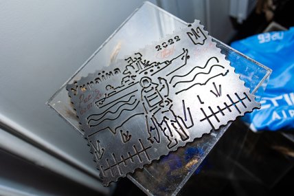 Ще один ексклюзивний лот — марка з "російським військовим кораблем", зроблена зі знищеного бронетранспортера росіян. Залізну пластину з фірмовим гравіюванням передав голова миколаївської ОВА Віталій Кім. Її продали за 541 500 грн.