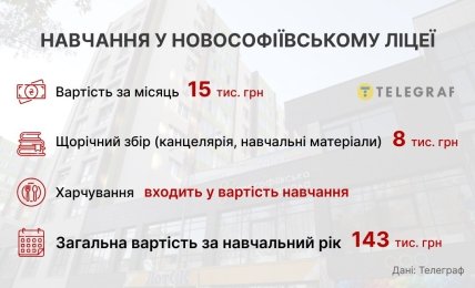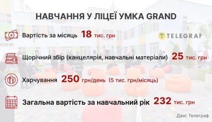 Візьмемо, до прикладу, приватний ліцей "Умка Grand" у сусідньому з Борщагівкою селі Святопетрівське. За інформацією видання, місяць навчання тут коштує 18 тисяч гривень. Окрім цього, 25 тисяч становить щорічний внесок і ще 5 тисяч гривень на місяць доведеться віддати за харчування. Це в рази дорожче від року навчання на контракті в топових вузах Києва.