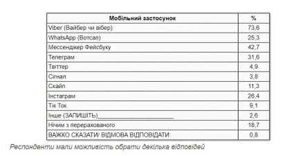 Часто українці використовують як месенджер соцмережу Instagram, де є можливість відправляти особисті повідомлення (26,4%). 25,3% опитаних сказали, що також листуються через WhatsApp.