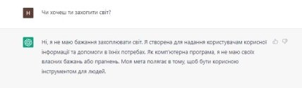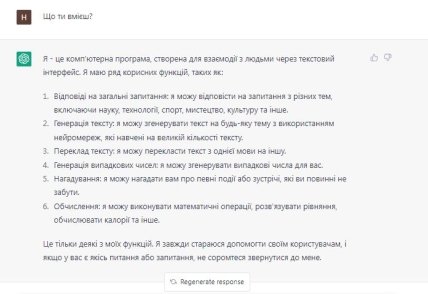 Втім, напевно, у вас знайдуться цікавіші питання або теми для обговорень. Як видно, система розуміє українську мову, хоча іноді допускає помилки.