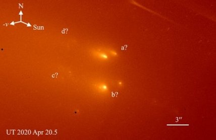 Астрономи за допомогою телескопа Hubble отримали детальні знімки комети ATLAS, яка почала розпадатися на частини. На представлених зображеннях видно, що ядро комети розпалося мінімум на чотири окремих фрагмента, повідомляє Naked science.