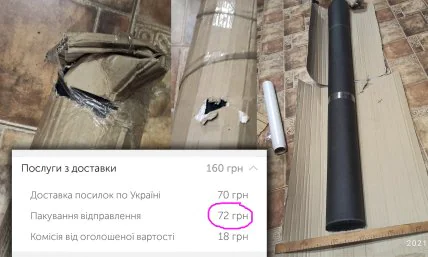 "Телеграфу" Галина Микитинець пояснила, що вона замовила рулон дуже дорогої тканини для виготовлення текстильних виробів. Ціна доставлення була, на її думку, абсолютно реальною – 70 гривень за рулон вагою трохи менше ніж 10 кг. А ось вартість пакування товару поштою (72 грн) її неприємно вразила, адже вона навіть перевищила саме пересилання.