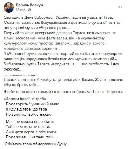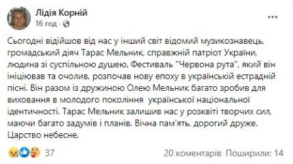 "Пішов тато… В день Соборності України!!! Ковід прийшов по нього, взяв його за руку і повів за собою у засвіти… Я думаю, що ми нізвідки не приходимо і нікуди не щезаємо… Я думаю що ми як квіти проростаємо з землі, в‘янемо, а потім на тому ж місці знов виростають нові квіти…", — написала донька музикознавця.