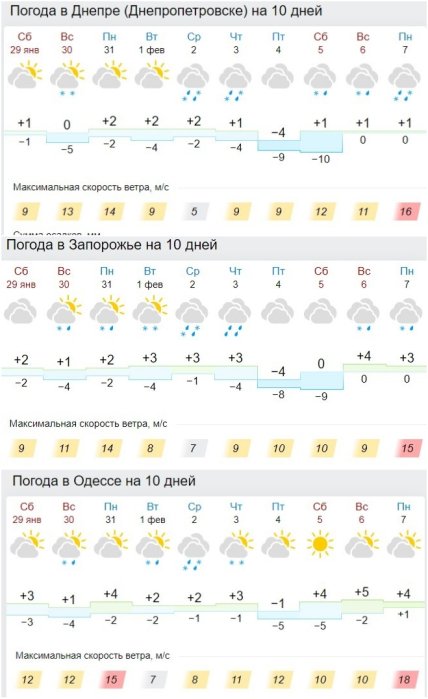 Схожа ситуація з більш вираженими нічними морозами до -13 та сильними поривами штормового вітру у Львові, Києві та Харкові. Найбільш вітряним, за прогнозами, стане Львів.