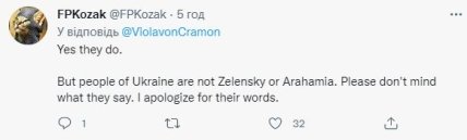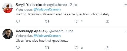 На її твіт відповіли багато користувачів з України, частина з яких відзначила, що у них виникає те саме питання. Здебільшого українські користувачі сперечатися з фон Крамон не стали, але деякі все ж таки зазначили, що не варто робити висновки про всю Україну щодо поведінки її керівництва.