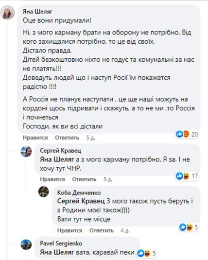 "От вони придумали! — знов-таки обурюється Яна Шеляг. — Ні, з моєї кишені брати на оборону не потрібно. Від кого захищатися треба, то це від своїх. Дістало, правда. Дітей безкоштовно ніхто не годує та комунальні за нас не платять!! Доведуть людей, що і наступ Росії їм здасться радістю!!! А Росія не планує наступати, це ще наші можуть на кордоні щось підривати і скажуть "а то не ми, то Росія" і почнеться".
