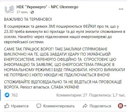 "Саме так працює ворог! Такі заклики спрямовані виключно на те, щоб завдати удару по українській енергосистемі", — йдеться у повідомленні.