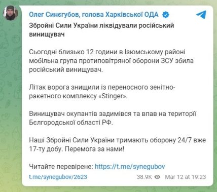 Він наголосив, що ворожий літак отримав пошкодження після влучення ракети з переносного зенітно-ракетного комплексу "Стінгер", після чого почав диміти. Проте він зміг дотягнути до кордону Росії та України та зазнав аварії вже в Білгородській області Росії.