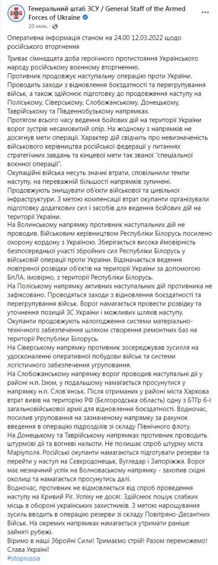 Зазначається, що противник проводить дії, спрямовані на відновлення наступу на ряді напрямків, однак через жорсткий опір українських захисників так і не зміг досягти своїх цілей.