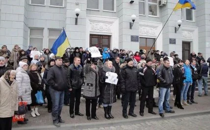 Тисячі херсонців вийшли на міську площу перед Херсонською ОДА із прапорами України. Мітингувальники скандують "Геть" та "Геть".