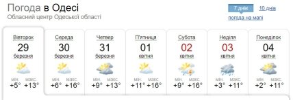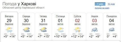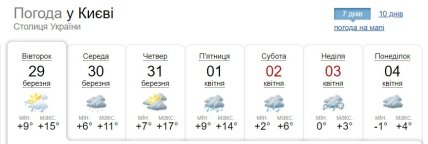 Вдень 29 березня у західних, північних, Вінницькій, Черкаській, Полтавській та Харківській областях місцями невеликий дощ. Максимальна температура повітря становитиме +12…+17 градусів, у Чернівецькій області та на Одещині до +19 градусів.