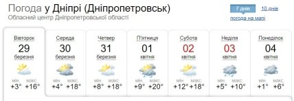 У Дніпрі до кінця березня погода буде теплою. За деякими прогнозами, може потепліти аж до 22 градусів. На початку наступного місяця дощитиме, температура повітря опуститься вночі до +1, вдень +6…+10 градусів.
