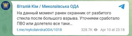 Пізно ввечері неділі, 10 квітня, російські окупаційні війська знову обстріляли Миколаїв, через що в місті було чутно потужний вибух.