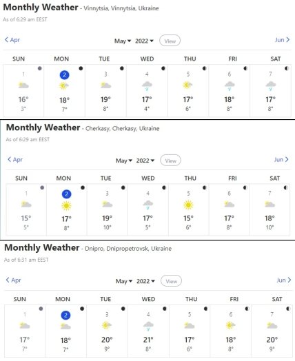 У Дніпрі та Запоріжжі буде тепло до 21 градуса Цельсія та похмуро, у Черкасах та Вінниці буде трохи прохолодніше. Можливі дощі.