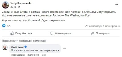 Варто зазначити, що пізніше голова фракції "Слуга народу" та член української переговорної делегації Давид Арахамія інформацію про передачу Україні ЗРК Patriot спростував, написавши, у коментарях під постом політолога Юрія Романенка, що "поки що інформація не підтверджується".