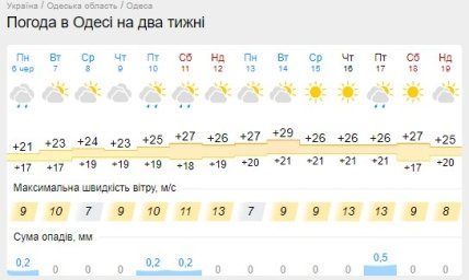 В Одесі очікуються не сильні дощі, переважно хмарно. Декілька днів будуть яскравими сонячними без найменшого натяку на хмари. Температурний максимум обіцяють +29, причому нічна температура в Одесі в середньому вища ніж в інших регіонах.