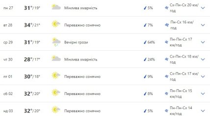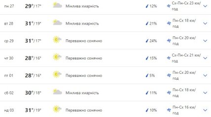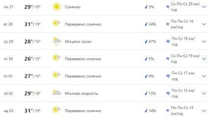 Максимальні температури — до +32°С — жителям та гостям столиці слід чекати у вихідні. Втім, решта днів буде лише трохи менш спекотною. Теплою буде і більшість ночей, стовпчик термометра не опуститься нижче +17°С. У середу ввечері, найімовірніше, варто чекати у гості грозу.