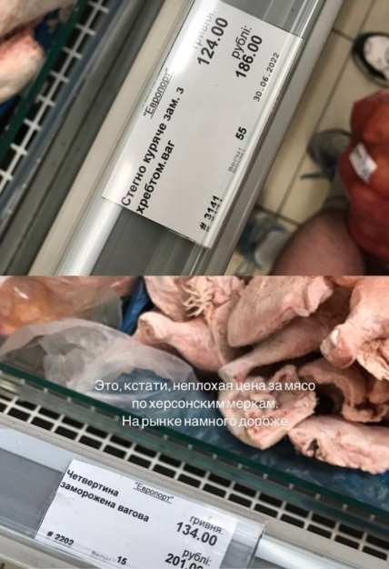 Як повідомляють місцеві жителі у соцмережах, багато продуктів харчування та побутових товарів, які продаються в магазинах, були вироблені та завезені до Херсона до початку вторгнення, але навіть на них ціни значно зросли.