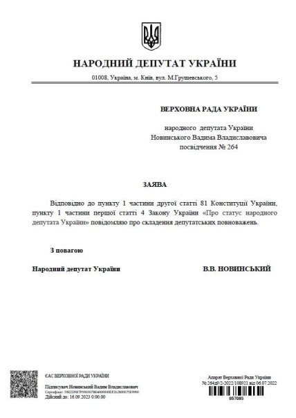 Верховна Рада на засіданні 8 липня 2022 року припинила повноваження народного депутата Вадима Новинського. Про це у своєму телеграм-каналі написав нардеп від "Голосу" Ярослав Железняк.