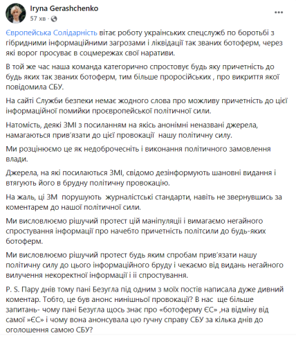 У самій "Євросолідарності" свою причетність до ботоферми заперечують. Як написала у Facebook нардеп Ірина Геращенко, ЗМІ пов'язали партію з повідомленням СБУ, навіть не звернувшись за коментарем, що є порушенням журналістських стандартів.