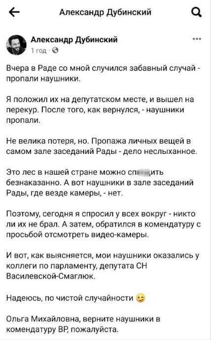 "Як з’ясовується, мої навушники опинилися у колеги по парламенту, депутата "СН" Василевської-Смаглюк. Сподіваюся з чистого випадку", — написав він.