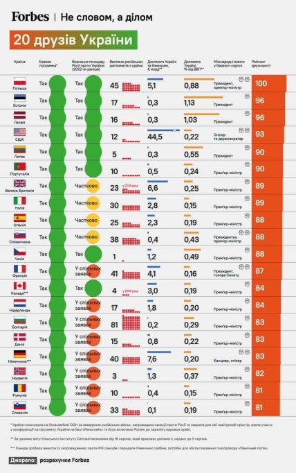 Видання Forbes склало рейтинг із двадцяти країн, які допомагали Україні найбільше. При цьому підтримку автори рейтингу оцінювали не лише у грошовому еквіваленті, а й також враховували дипломатичні кроки.