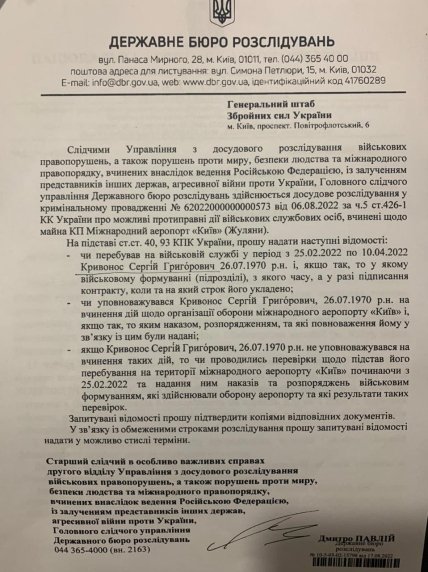 "Слідчі ДБР отримали вказівку визнати незаконним наказ підписаний особисто головнокомандувачем ЗСУ Валерієм Залужним про призначення мене командиром оборони аеропорту Жуляни та про зарахування мене на військову службу. Тому порушено замовну справу, що я нібито видавав незаконні накази при організації оборони аеропорту Жуляни ", — повідомив Кривонос.