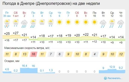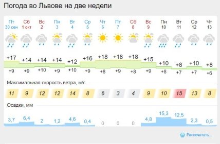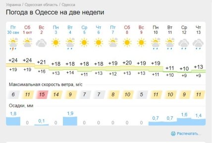 Зокрема, 30 вересня, на свято Віри, Надії, Любові та Софії температура повітря становитиме +18+23 градуси, на сході до +24, а на півдні місцями аж до +25+27 градусів.