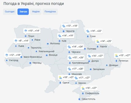 Дощі при цьому очікуються лише місцями — трохи зачеплять східні та західні регіони вдень, а у вечірній час можуть дістатися до Житомирської, Київської та Луганської областей.