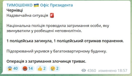 "Нацполіція проводила затримання особи, звинуваченої у розбещенні неповнолітніх. 1 поліцейська загинула, 1 поліцейський отримав поранення. Підозрюваний укрився у багатоквартирному будинку. Операція із затримання злочинця триває", — написав він.