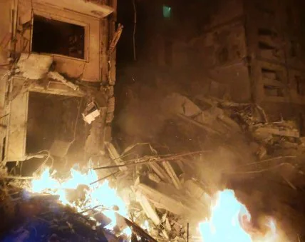 На фото, що з’являються в соціальних мережах, видно, що в одному з будинків обрушилося кілька поверхів.