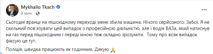 UPD 13:15 Ткач розповів, що вранці його збив автомобіль на пішохідному переході, проте він не пов'язує інцидент зі своєю професійною діяльністю.