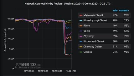 Також Netblocks опублікував графік із "падінням" інтернету в низці українських областей: