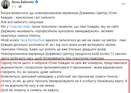 Щоб довести факт того, що Каждан займається гіпнозом, журналісти вирішили записатись до неї на сеанс. Під час розмови вона охоче записала дівчину на консультацію та пояснила свої методи роботи. Важливо відзначити, що обидві бесіди відбулися у робочий час нової керівниці.