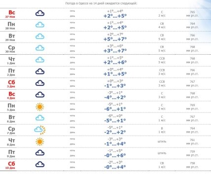 Снігопади розпочнуться з неділі, 27 листопада. Далі мокрий сніг із дощем очікується у понеділок, 28 листопада. Починаючи з середини наступного тижня, 30 листопада – 1 грудня, похолодає до -2°C вдень та -5 градусів у нічний час.