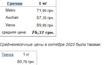 Порівняно з жовтнем цього місяця можна побачити зниження цін на гречку. Середній цінник на цю крупу впав майже на 4 гривні з 80,78 грн. до 76,37 грн. Найвигідніше цей продукт можна придбати в мережі супермаркетів "Ашан". Там гречку продають за ціною 67,30 за кілограм.