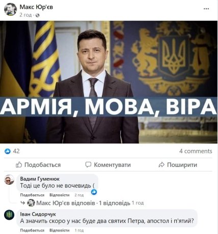"Так і докотився до "Армії, мови, віри", "Десь плаче осторонь Петро ", — вважають вони.