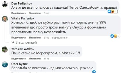 "Зараз розпочнуться хресні ходи до Києва, інспіровані ФСБ", "Хотілося б, щоб це гніздо розігнали до біса, але на 99% впевнений, що просто трохи нагнуть Онуфрія, і той формально проголосить повну незалежність", "Бджоли проти меду, а парафіяни УПЦ МП проти УПЦ МП", — вважають скептики.