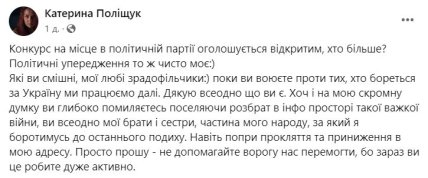 "Ви все одно мої брати і сестри, частина мого народу, за який я боротимусь до останнього подиху. Навіть попри прокляття та приниження в мою адресу. Просто прошу — не допомагайте ворогу нас перемогти, бо зараз ви це робите дуже активно", — написала Катерина Поліщук на своїй сторінці у Facebook.