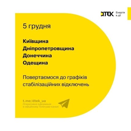 Як повідомляє офіційний телеграм-канал ДТЕК, йдеться про Київську, Дніпропетровську, Донецьку та Одеську області. Туди планові відключення енергії повертаються із понеділка, 5 грудня.