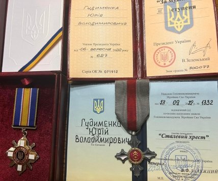 Молодший сержант Юрій Гудименко отримав орден "За мужність" ІІІ ступеня та почесний нагрудний знак Головнокомандувача Збройних сил України "Сталевий хрест", — їх вручив командувач Сил територіальної оборони ЗСУ генерал-майор Ігор Танцюра.