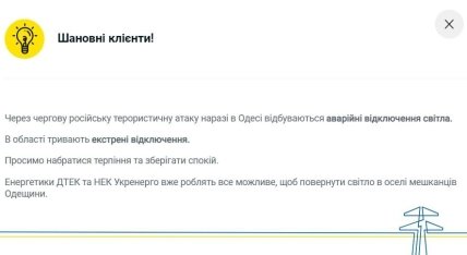 Що стосується Одеської області, то згідно з повідомленням ДТЕК, там поки тривають як планові, так і аварійні відключення.