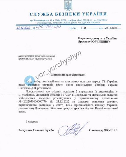 У СБУ відреагували на звернення та заявили, що слідчий відділ структури по Луганській та Донецькій областях вже проводить розслідування в рамках кримінального провадження, яке було відкрито 23 грудня 2022 року.