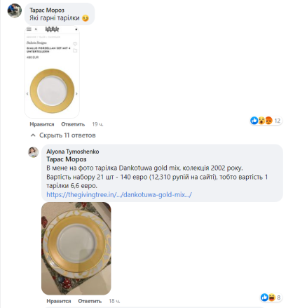 UPD: дружина Кирила Тимошенко стверджує, що насправді це інші тарілки з колекції Dankotuwa gold mix 2002 року вартістю 140 євро за 21 одиницю (близько 5,5 тисячі гривень за набір).