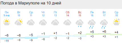 Згідно з прогнозом погоди на сайті Gismeteo, у найближчі кілька днів температура повітря в Маріуполі опускатиметься до -5…-6 градусів вдень і від -9 до -11 градусів у нічний час. З 15 січня ситуація з погодою має трохи покращитись. Проте такі плюсові температури не змінять ситуації для городян.