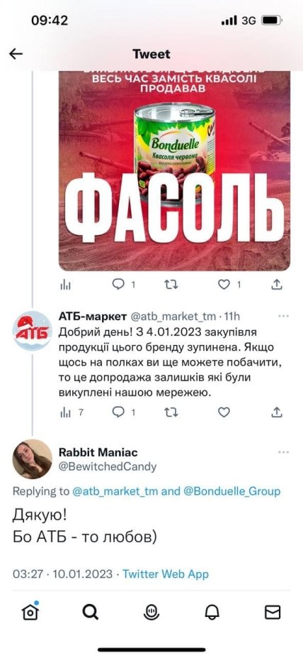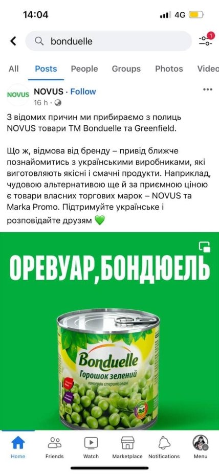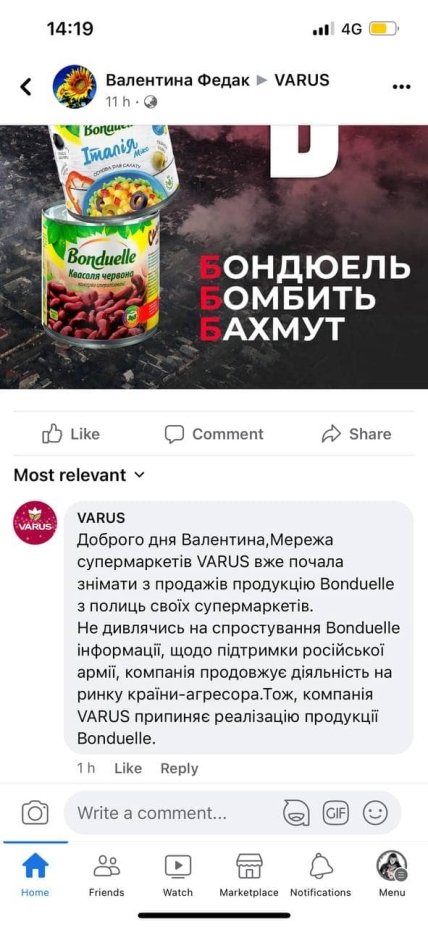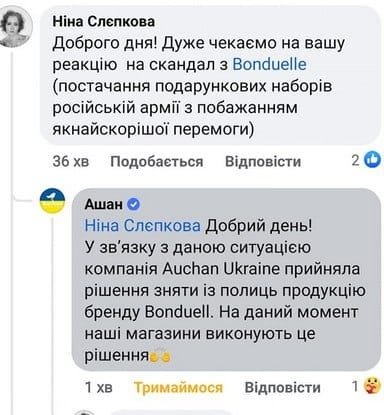 На тлі скандалу за участі французького виробника заморожених та консервованих овочів Bonduelle, який надавав гуманітарну допомогу окупаційній армії росії, велика кількість мережевих супермаркетів в Україні прийняли рішення припинити співпрацю із Bonduelle Group. До цього списку увійшли такі компанії як VARUS, АТБ-Маркет, NOVUS і "Ашан".