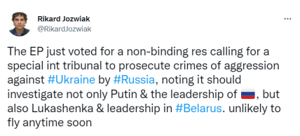 Про це на своїй сторінці у Twitter повідомив журналіст Рікард Йозвяк, зазначивши, що в рамках резолюції ЄП закликає створити спеціальний міжнародний трибунал для переслідування воєнних злочинів в Україні не лише володимира путіна, а й його поплічника — лукашенка.