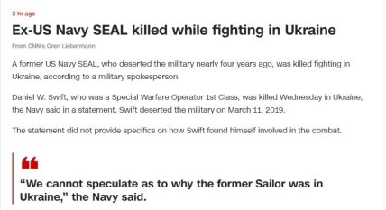 Так, нещодавно в нашій країні загинув відставний американський військовий Деніел Свіфт, який раніше служив у спецназі ВМС США, повідомляє CNN.