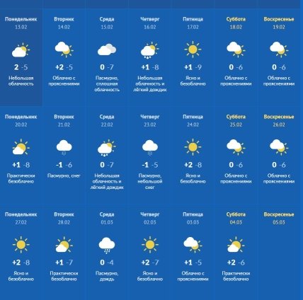 У неділю, 5 лютого, на більшій частині території України очікується невеликий сніг, мокрий сніг. Температура повітря в нічний час становитиме -9...-4°С, вдень -5...0°С. У південних та центральних регіонах вночі -6...-1°С, вдень -1...+4°С. У Карпатах уночі -13...-8°С, днем -8...-3°С.