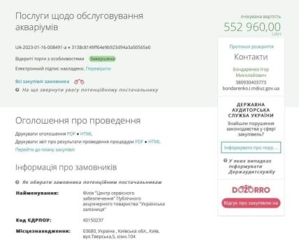 Він додав, що ціна договору на Прозорро склала 497 664 грн, а це на 10% нижче за очікувану 552 960 грн. Обслуговування одного акваріуму протягом місяця становить 1000 грн.